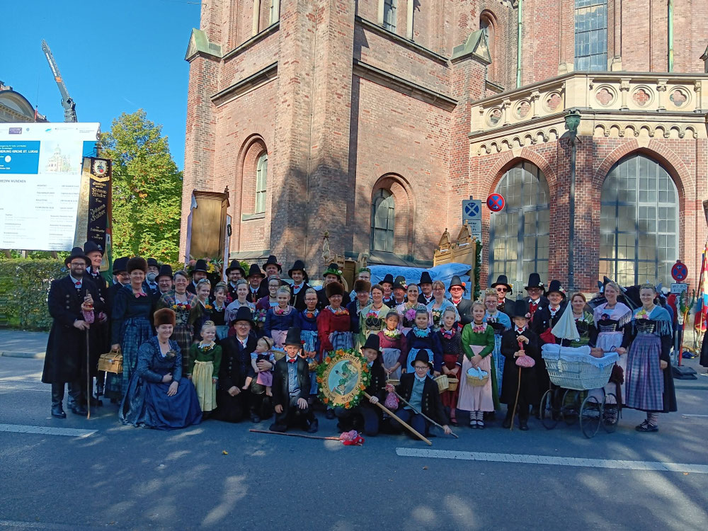 Schon wieder sind zwei Jahre vorbei und wir waren wieder dabei beim Wiesnzug am 21.09.2025 in München. Mit 57 Teilnehmern präsen-tierten wir unseren Verein in Form einer nachgestellten Hochzeits-gesellschaft. Das Herzstück bildet wie immer der Kammertwagen auf dem die Aussteuer der Braut zusammengestellt ist. In vielen Arbeitsstunden wird der Wagen im Vorfeld aufwändig vorbereitet. Vielen Dank an dieser Stelle an alle Helferinnen und Helfer, die zu diesem tollen Ereignis beigetragen haben. Es war heiß und anstren-gend aber trotzdem ein wahnsinniges Erlebnis für Groß und Klein.